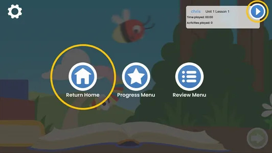 В любое время родители могут приостановить занятия ребенка (верхний правый угол), нажав на значок «Home» (Дом), чтобы выйти из системы.